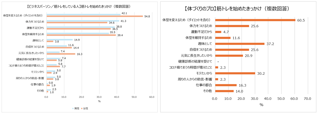 ビジネスパーソンが筋トレを始めたきっかけについて、1位は男女ともに「体型を変えるため(ダイエットを含む)(男性:42.1%、女性:54.8%)」で、男性の2位は「体力をつけるため(41.3%)」、女性の2位は「体型を維持するため(39.4%)」でした。体づくりのプロも、「体型を変えるため(ダイエットを含む)(60.5%)」が1位に。ビジネスパーソンと体づくりのプロはジムで実施している運動には差があったものの、きっかけは同じであることが分かりました。
