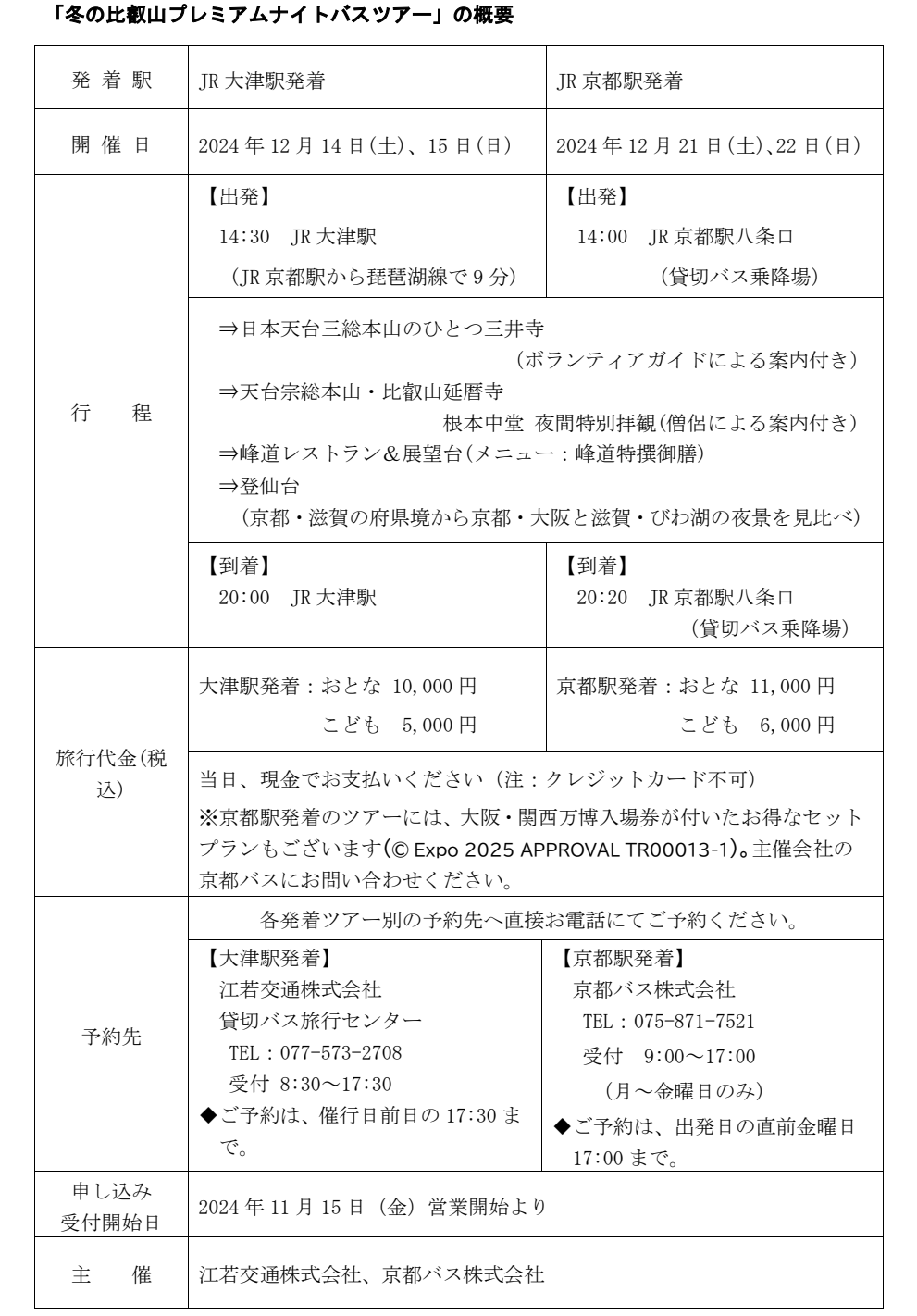 江若交通株式会社(本社:滋賀県大津市、代表取締役:安積正彦)と京都バス株式会社(本社:京都市右京区、代表取締役社長:吉本直樹)は、一般社団法人比叡山・びわ湖DMOの協力を得て、標高800mの比叡山から京都・大阪・滋賀の夜景を満喫する「冬の比叡山プレミアムナイトバスツアー」の販売を開始します。