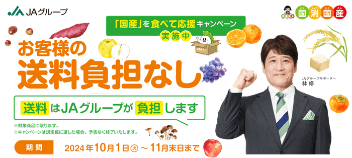 10月・11月の「JAグループ国消国産月間」にあわせ、「JAタウン」では“継続的に国産農畜産物を購入してもらうきっかけをつくる”ことを目的に、対象商品を「お客様送料負担なし」で購入できるキャンペーンを実施中です。
