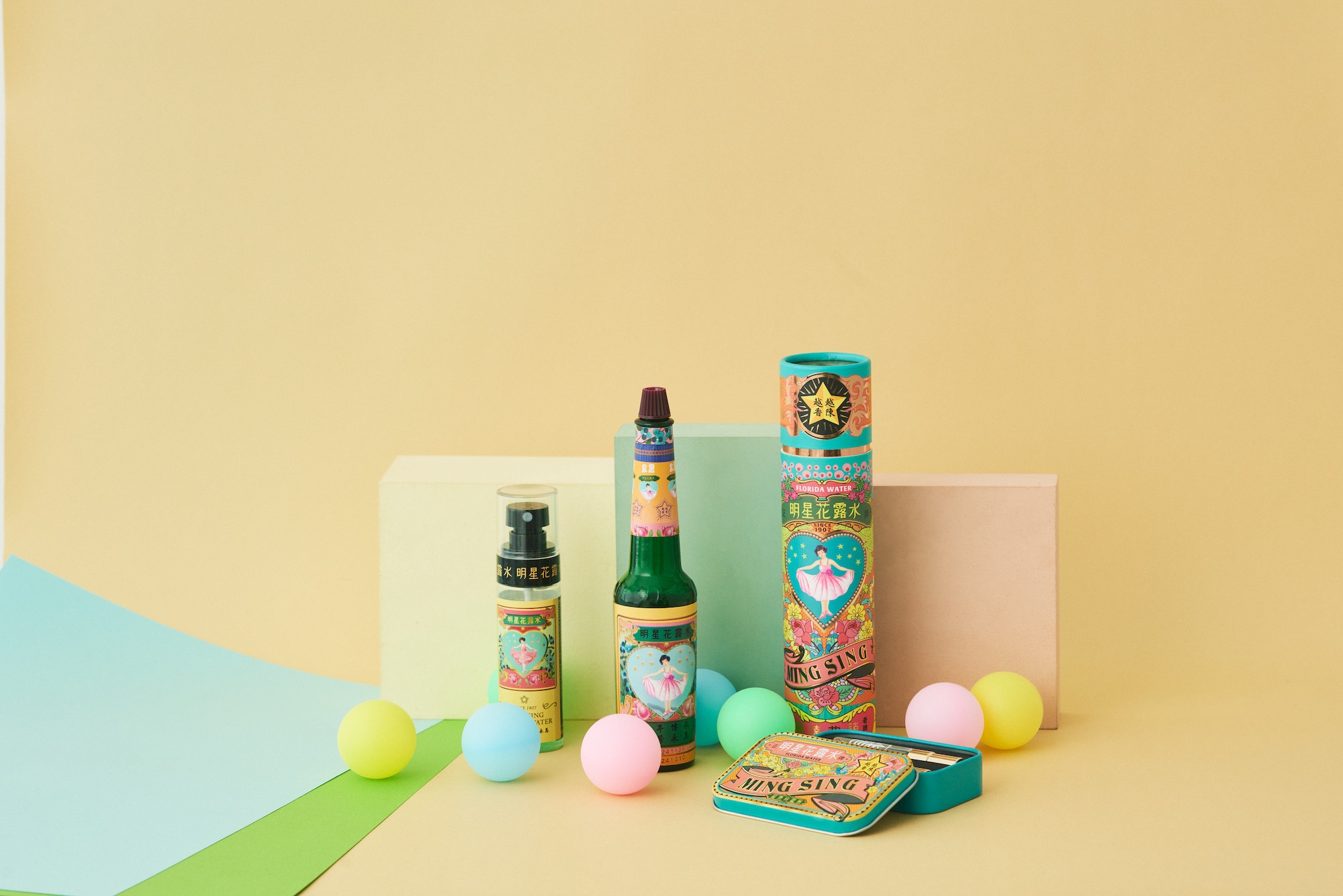 1907年、『中華薬典』を参考にし、ローズやジャスミンなど多くのフローラルオイルと食品用アルコールを配合した皮膚薬として、当時の上海「中西薬局」会長の周邦俊(チョウ・バンチュイン)医師により開発されたのが始まりです。その後、上海のクラシックな濃い緑色のガラス瓶、西洋化されたピンクのバレエ衣装を纏った少女をイメージキャラクターに据えた明星花露水は、モダンファッションの象徴となりました。1945年より製造工場が台湾に移った現在も、何世代にも渡り深く愛され続けているのが明星花露水なのです。