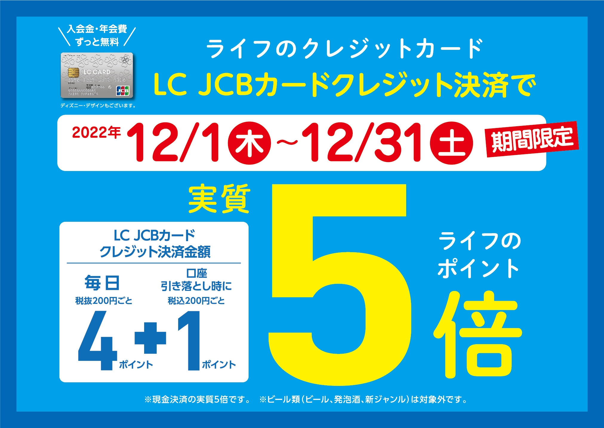 「LC JCBカード」は、入会費・年会費がずっと無料、ライフで一番お得にポイントが貯まるカードです。新規ご入会・ご利用(※1)で、ライフのポイント最大3,000ポイントをプレゼントしております。通常はポイント倍率が現金決済の実質3倍(※2)のところ、12月1日から31日までの間は「LC JCBカード」決済でお買い物いただくと、200円(税抜)につき1ポイントに加え、クレジット決済で3ポイント、さらに200円(税込)につき1ポイントの口座引き落としポイント(※3)が進呈されて、ライフのポイントがいつも以上にお得な「実質5倍」(※4)となる特別キャンペーンを実施いたします。クリスマスや年末年始の準備などで慌ただしく出費も重なる12月のお買い物は、ぜひお得な「LC JCBカード」をご利用ください。