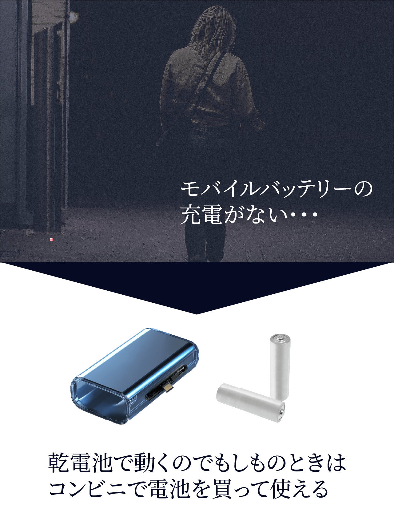 乾電池式なのは、調達のしやすさとモバイルバッテリーの充電を忘れていたら使えなくなるからです。
