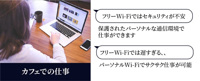 外出中のスキマ時間、家で集中できないときなどで、カフェなどで仕事をする人も増えている中、セキュリティやWi-Fi速度の関係でフリーWi-Fiは利用できないという場合も問題なし。パーソナルWi-Fiで気にせず仕事ができます。