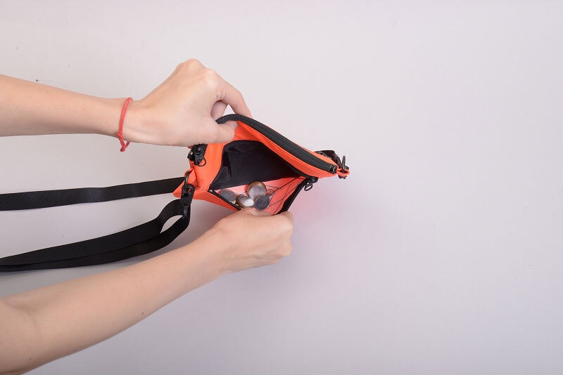 海外旅行や見知らぬ場所で気を付けたいスリに対応できるよう、上着の下に着けられる薄い本体と細いショルダーストラップとなっています。