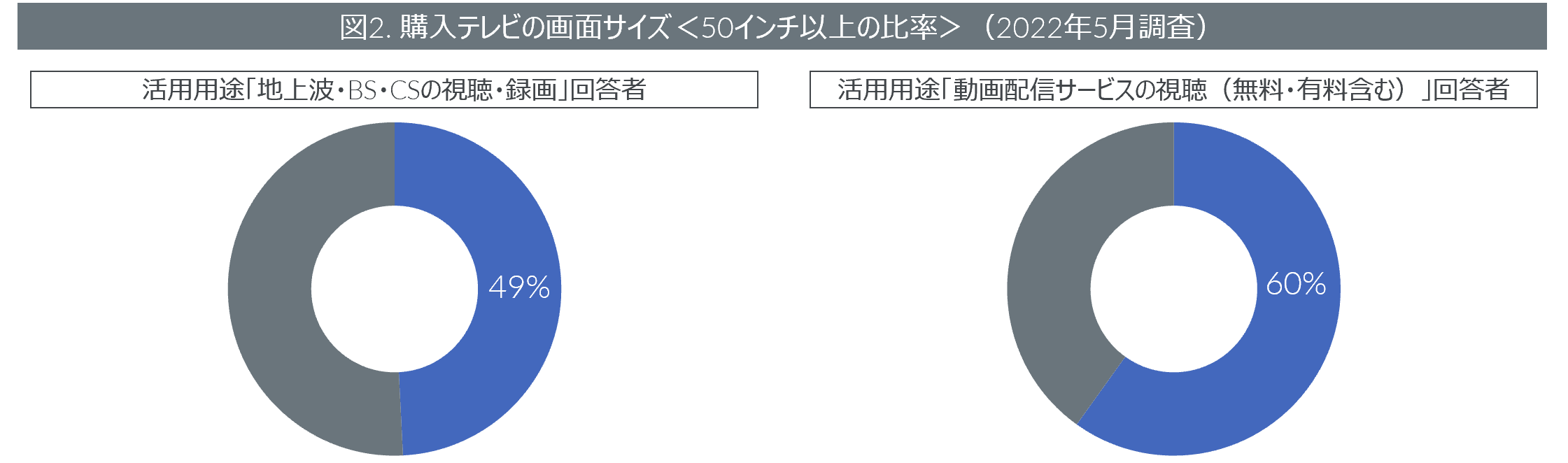 活用用途で「動画配信サービスの視聴(無料・有料含む)」と回答した人の購入テレビの画面サイズを見ると、60%が50インチ以上の製品を選択していることが分かった(図2)。これは「地上波・BS・CSの視聴・録画」と回答した人の50インチ以上の購入率49%と比較して11%ポイント高く、テレビで動画配信サービスを視聴する人はより大型の製品を購入する傾向があると言えるだろう。