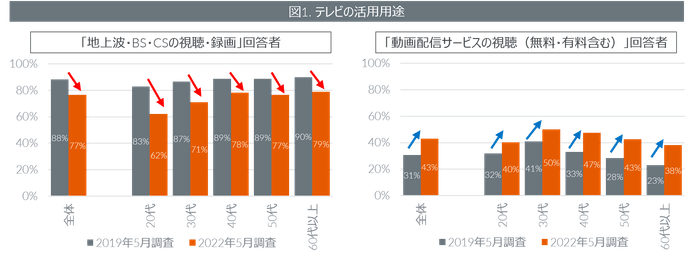 テレビの活用用途を、コロナ以前の2019年調査結果と比較すると、「地上波・BS・CSの視聴・録画」が88%から77%に減少、一方で「動画配信サービスの視聴(無料・有料含む)」が31%から43%に増加した(図1)。