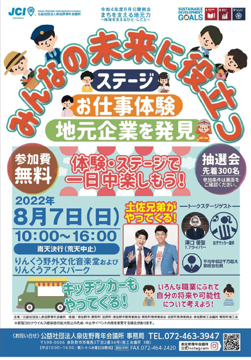 公益社団法人 泉佐野青年会議所(活動エリア:大阪府泉佐野市・泉南郡熊取町・泉南郡田尻町、理事長:熊野 雅樹)は、イベント「まちを支える地元力 ~地域を支えるひと・しごと~」を8月7日(日)大阪府泉佐野市りんくう野外文化音楽堂およびりんくうアイスパークにて開催致します。