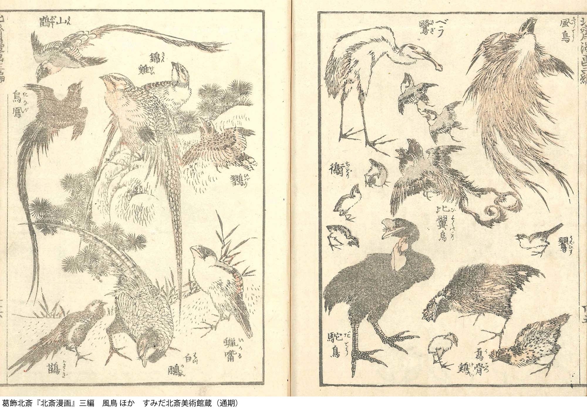 ・「鵙 翠雀 虎耳草 蛇苺」(前期)、「文鳥 辛夷花」(作品を替えて通期展示)、「鵤 白粉花」(後期)、「鵙 小薊」(後期)、「杜鵑」(前期)、『北斎漫画』三編 風鳥 ほか(通期)