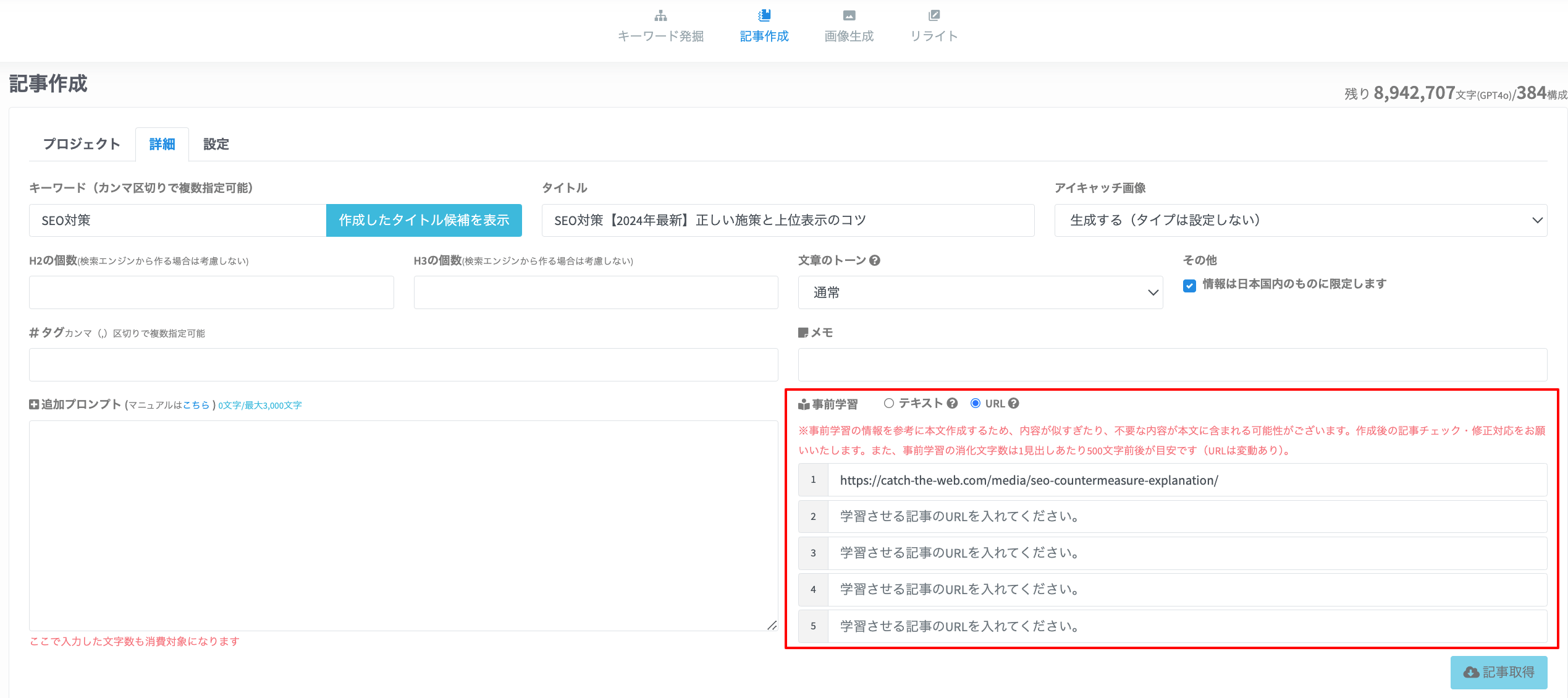 特定のテキストやURLを事前に学習させ、その内容を元にして記事を生成します。