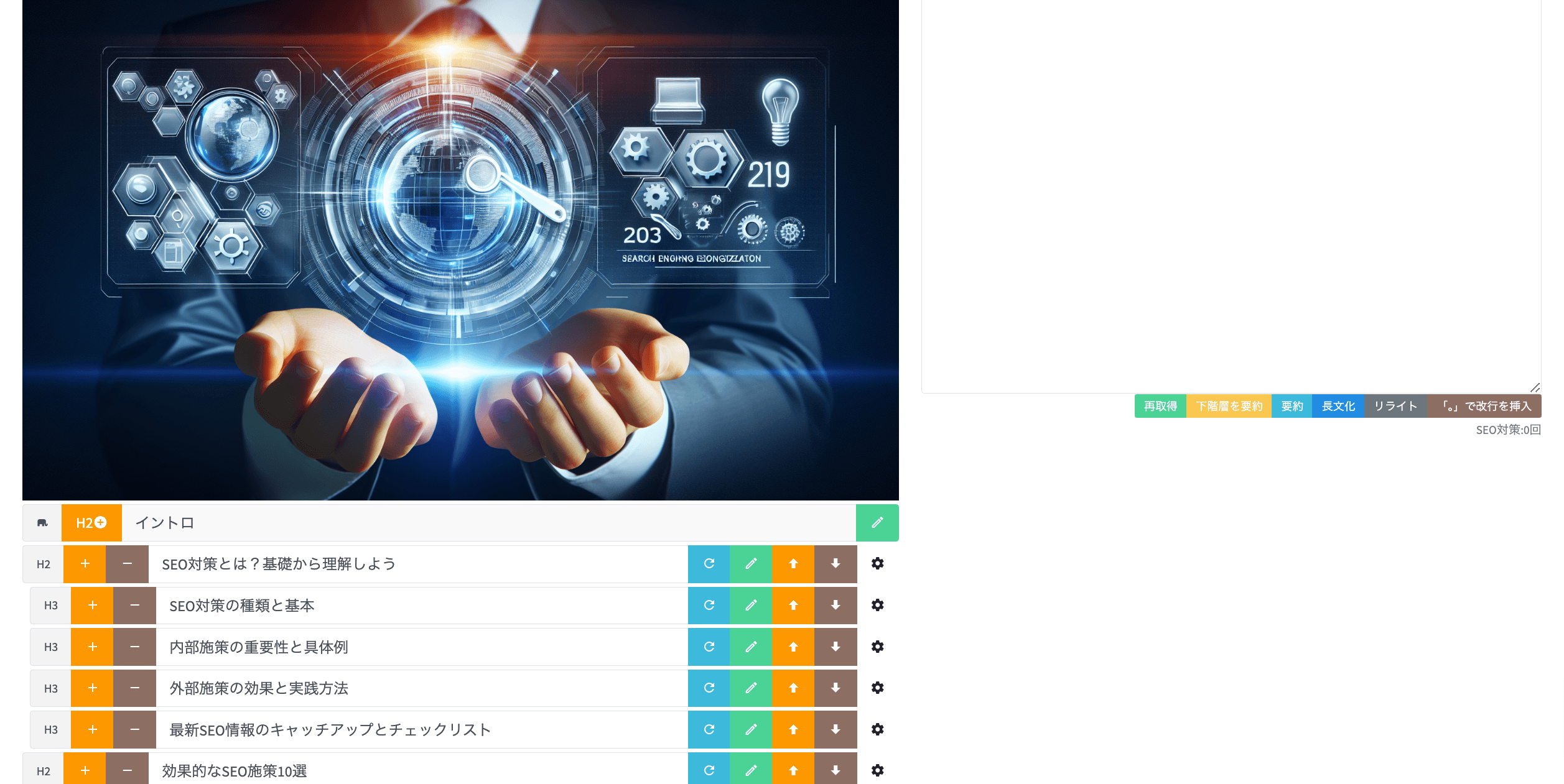 見出しごとに検索意図に沿った本文を生成します。再取得機能や要約機能、長文化機能などを使って最適化することも可能です。