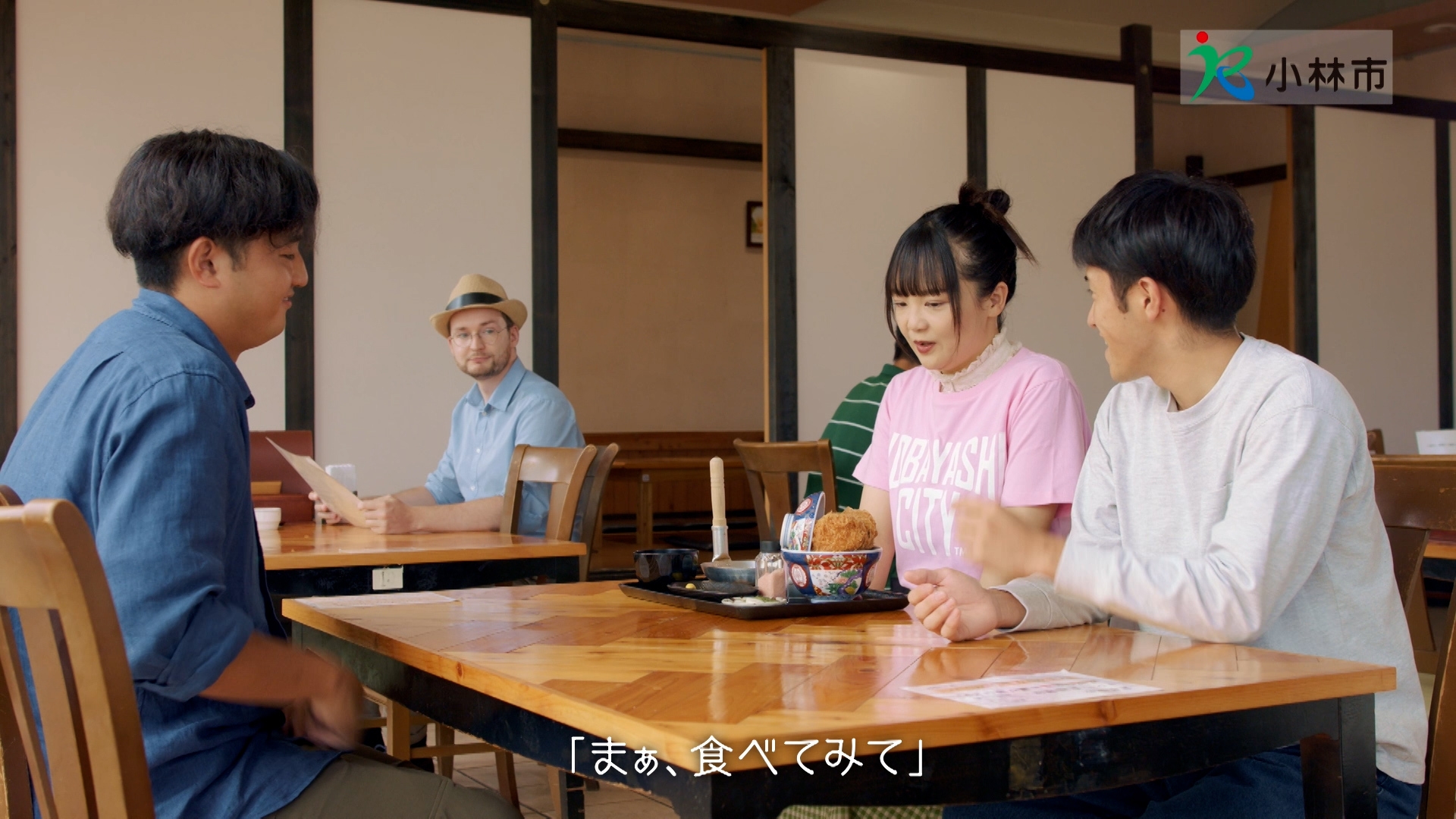 小林市の食の魅力をPRするCMシリーズで、小林市出身の蛙亭・イワクラさん(吉本興業所属)が主演を務め、脇を固めるのは老若男女の市民キャスト。方言で会話を繰り広げながら、郷土料理や新名物料理に舌鼓を打つシーンを描きました。