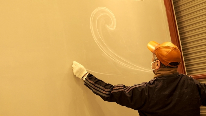 ▼店舗はオーナー自らがデザイン。壁のラインを描く様子