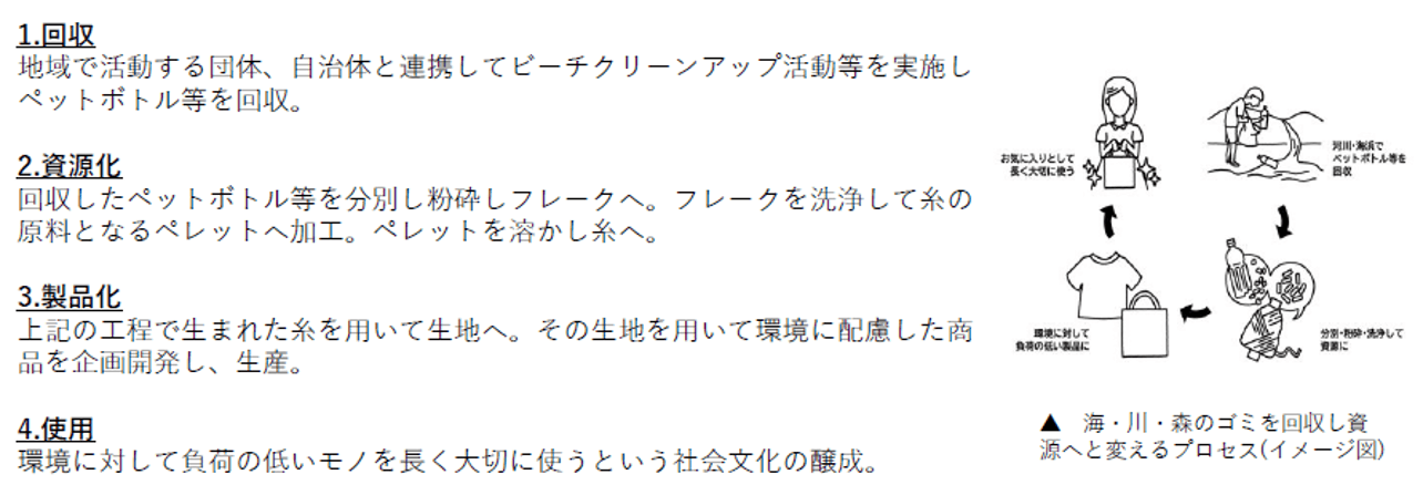 『UpDRIFT®』は海岸等で回収したペットボトル等を繊維の原料として資源化し、環境負荷の低い新しい製品として蘇らせるプロジェクトです。原料となるペットボトルは、地域活動団体や地方自治体、企業等と連携して行うクリーンアップ活動「Green and Blue Challeng®(グリーン アンド ブルー チャレンジ)」を通して回収し、分別や洗浄を行ってから資源化・製品化しています。