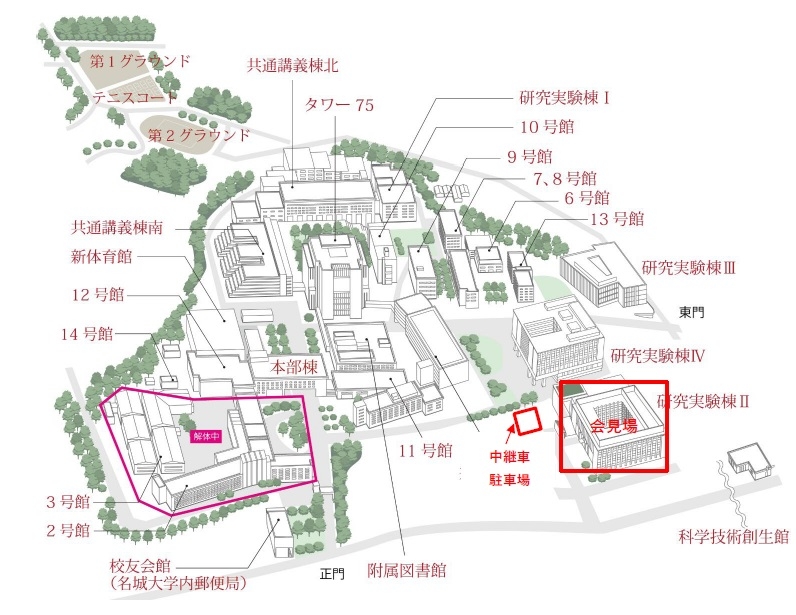 研究実験棟Ⅱの前で下車の上、周辺に待機させないようご協力ください。
