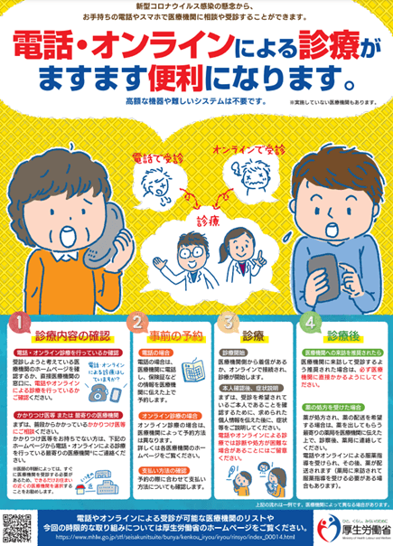 新型コロナウイルスが短期間に急増している現在、「発熱してもなかなか発熱外来に受診できず苦慮しているので、どこか受診できるところを知りませんか?」というお問い合わせがありました。皆さんも心配な症状があれば是非早めに病院へ受診してほしいのですが、現在では、感染を恐れる人の為にオンライン診療も充実しております。 厚生労働省のサイトには、オンライン診療の病院のリストもあります。ご活用ください。