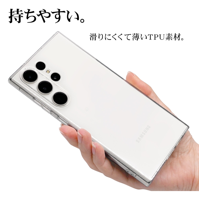滑りにくく、TPU(熱可塑性ポリウレタン)樹脂で端末を衝撃から護ります。