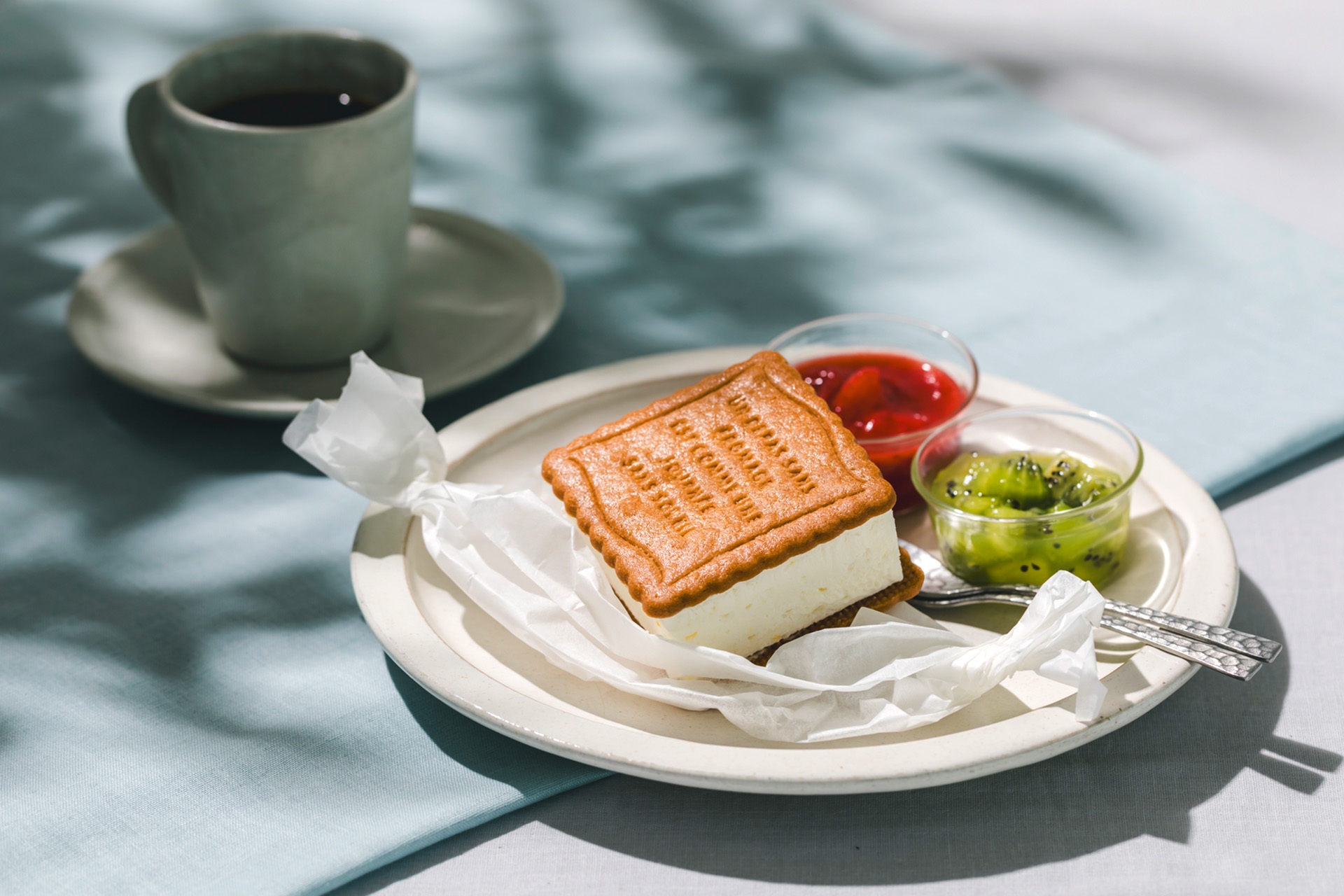 夏らしく、ひんやり凍らせたフロマージュムースをしっとりクッキーでサンド。手に持ってそのまま頬張ったり、旬の果実ソースと合わせたり。ムースが滑らかな食感に解凍されるのをじーっと待つのもオススメです。