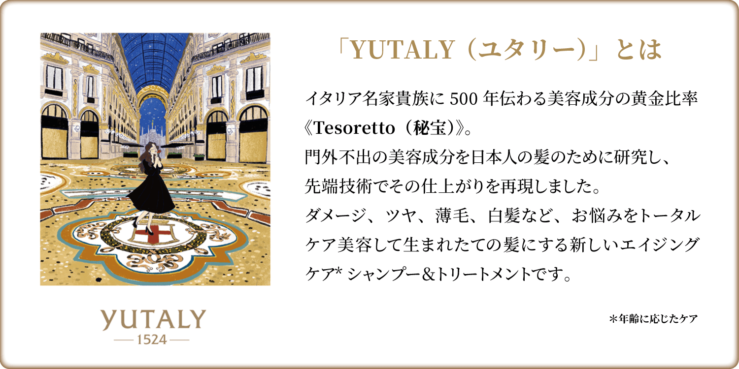 500年に渡りイタリア名家貴族に受け継がれてきた天然の美容成分≪Tesoretto(秘宝)≫を再現。それは、古代種海藻、ハチミツ、オリーブオイル、テルメ成分、かんきつ類などを調合した美容成分の黄金比率。その門外不出の黄金比率を日本人の髪のために研究し、先端技術で仕上げています。
