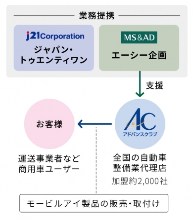 ジャパン・トゥエンティワン株式会社(本社:東京都渋谷区/代表取締役社長:加藤充、以下、J21)は、今般、三井住友海上グループのエーシー企画株式会社※1(本社:東京都千代田区/取締役社長:依田卓弥、以下、エーシー企画)と後付け衝突防止補助システム「モービルアイ」の取付・販売特約店支援に関する業務提携を結びました。J21は、本業務提携を通じて、三井住友海上火災保険株式会社が支援する自動車整備工場の組織であるアドバンスクラブ※2(会長:糀谷尚久、以下、AC)による「モービルアイ」の取付認定工場資格の取得、特約店化を支援していきます。