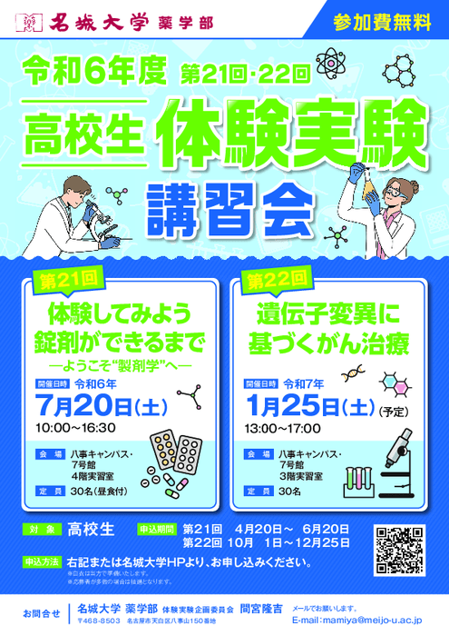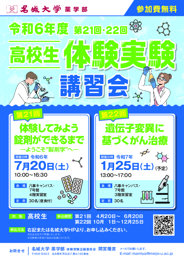 名城大学八事キャンパス薬学部は、今年も高校生対象で体験実験講習会を開催します。今年度は7月20日(土)と1月25日(土)の2回開催予定です。