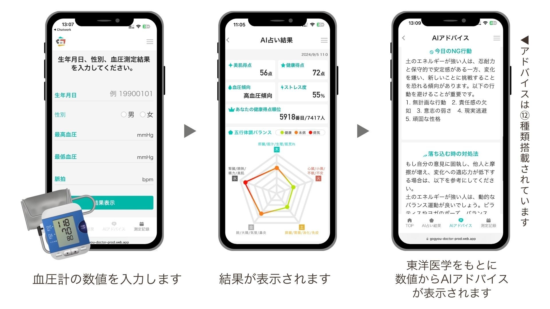 - 血圧測定データの可視化:測定データを基に、五臓六腑の健康バランスをレーダーチャートで表示。日々の体調を視覚的に捉えることができます。