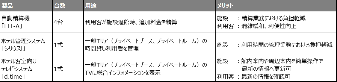 当社が提供する「FIT-A」は温浴施設に特化した自動精算機で、館内の各施設で発生した追加料金をリストバンドで管理し、退館時にまとめて精算する運用が可能です。精算業務におけるスタッフの負担軽減や利用客の混雑緩和などの効果に期待いただき、導入にいたりました。「FIT-A」に加え、「シリウスi」や「d.time」、グループ会社の株式会社USENが提供するAI搭載の店舗向けBGMサービス「USEN MUSIC シリーズ」や業務用ロボット(配膳・清掃・運搬)もあわせて導入することで、施設運営を総合的に支援、ホスピタリティの向上にも貢献してまいります。