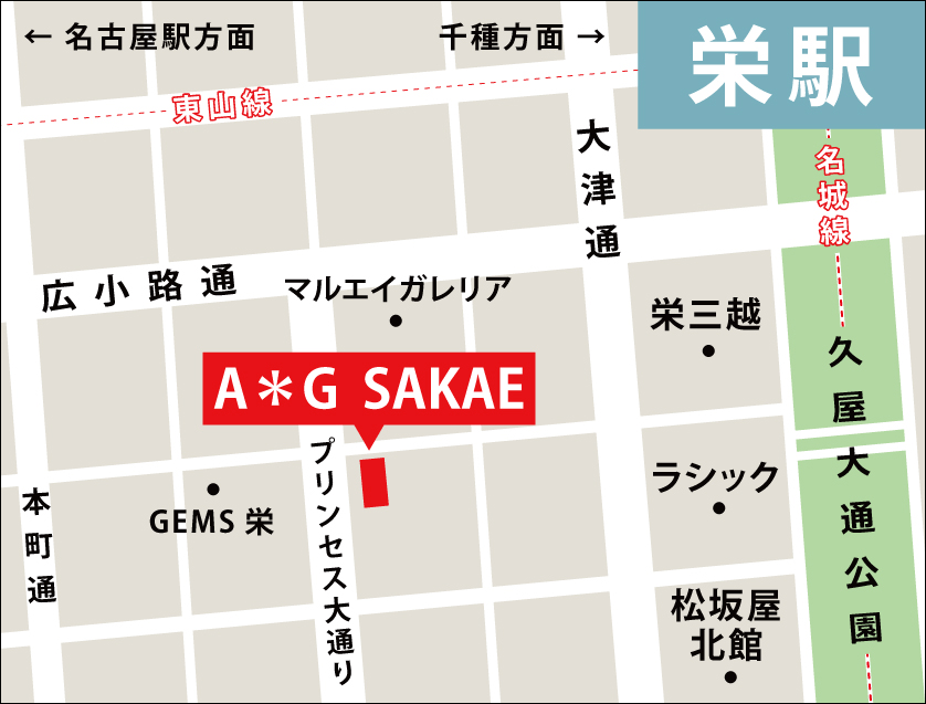 アクセス 名古屋市営地下鉄「栄駅」サカエチカ8番出口から徒歩3分