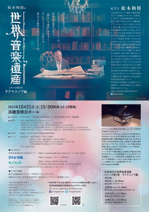 世界音楽遺産実行委員会主催、『松本和将の世界音楽遺産 シリーズ第7回 ラフマニノフ編 -帰るべき場所-』が下記の通り上演されます。