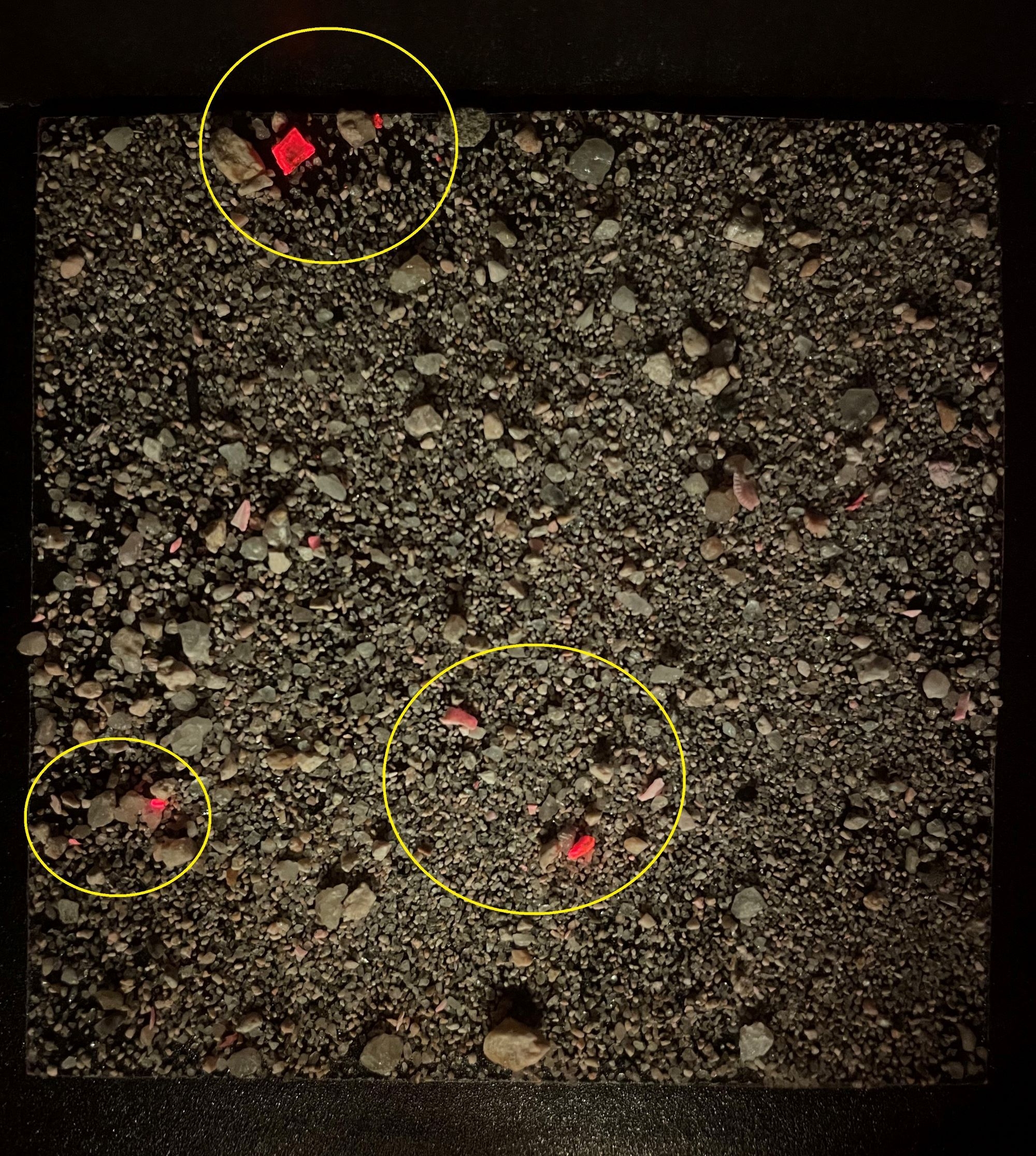 (2) 緑色光を照射することで染色した砂中のプラスチックが光る