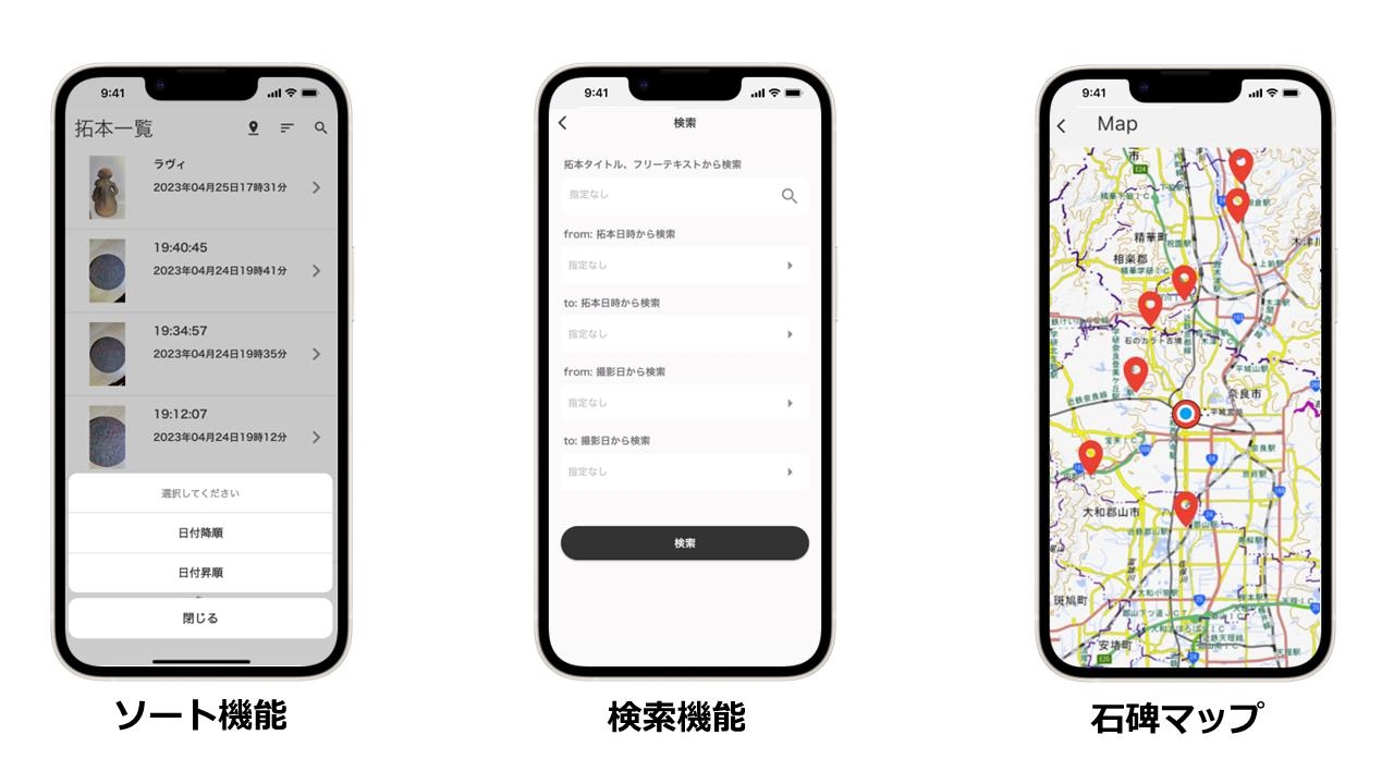 アプリで作成したひかり拓本の履歴がアプリ内でリスト化され、撮影日時、場所などの詳細を確認できます。また、ソート機能、検索機能に加え、スマートフォンのGPS機能を利用し、石碑マップの表示機能を実現。これにより、ひかり拓本の履歴を視覚的にもわかりやすく管理できます。