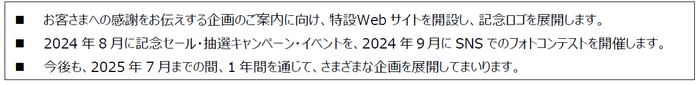 周年記念の取り組みのご案内を行う特設Webサイトを開設します。今後、キャンペーンなどのおトクな情報や、特別イベントの開催日程、客室乗務員の新制服の紹介や、社員からお客さまへの感謝の言葉などを掲載してまいります。