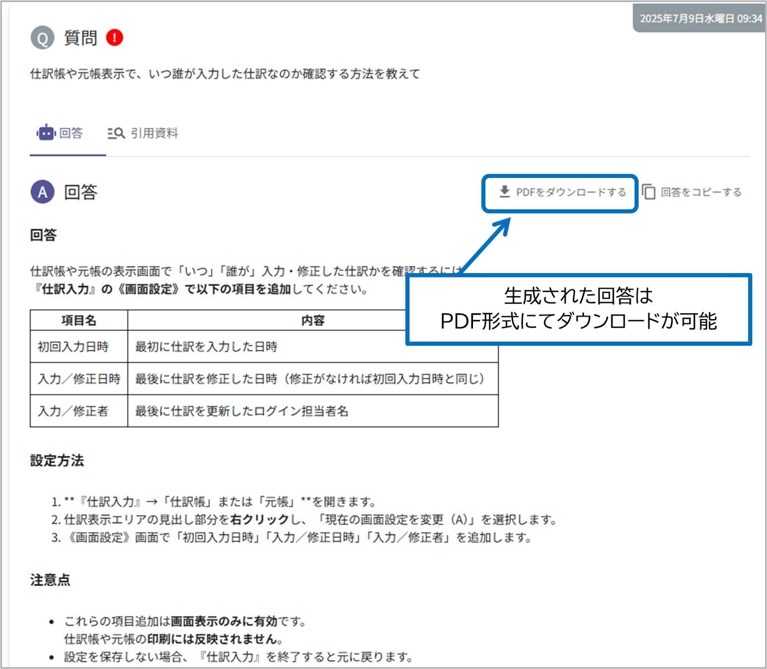 会計事務所のお客さま向けサポートサイト「TVS」より『MJS AIアシスト』を起動し、質問をテキストで入力すると、関連性の高い類似FAQ記事が表示されます。そこから画像付きの解説記事を確認し、問題解決を図ることが可能です。FAQで解決しない場合には、同画面内にある「AIで回答」ボタンをクリックすることで、AIが生成した回答を、引用元のFAQやマニュアルへのリンクと共に得ることができます。また、生成された回答はPDF形式にてダウンロードができ、手元資料としてご活用いただけます。なお、リソースの最適化の結果、社内先行利用時(『MJS BOT(※3)』)よりも精度は15%向上、生成スピードは3分の1以下に短縮できたことにより、お客さまはストレススムーズに疑問を解決いただけます。
