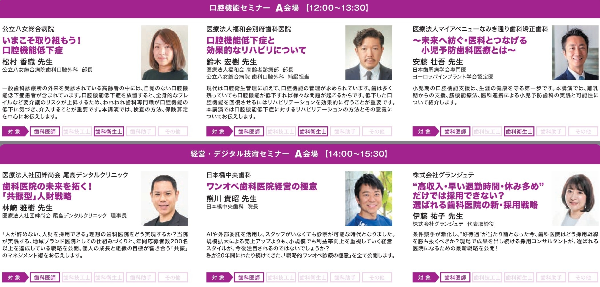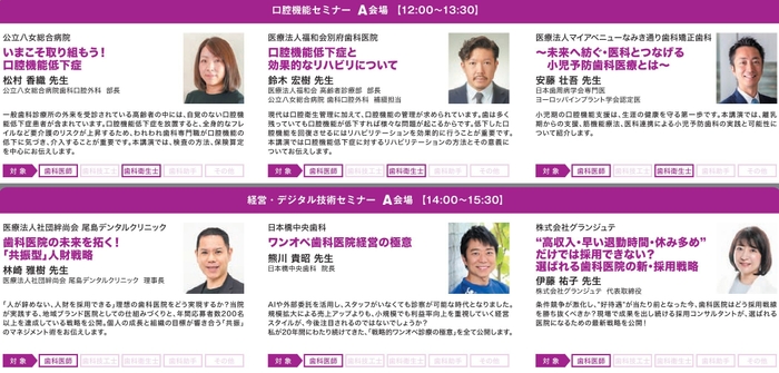 主催者企画セミナーでは、27日(土)にセミナールームAにて、「口腔機能」や「経営デジタル技術」をテーマとした講演が行われます。