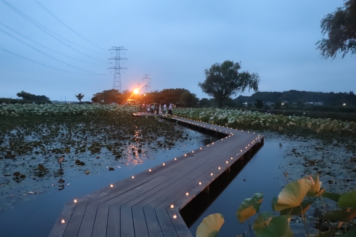 『キャンドルロード』 木道に灯るLEDキャンドルの灯りと、ライトアップされた水面の古代ハス。昼間とは違ったムーディーな雰囲気をお楽しみください。