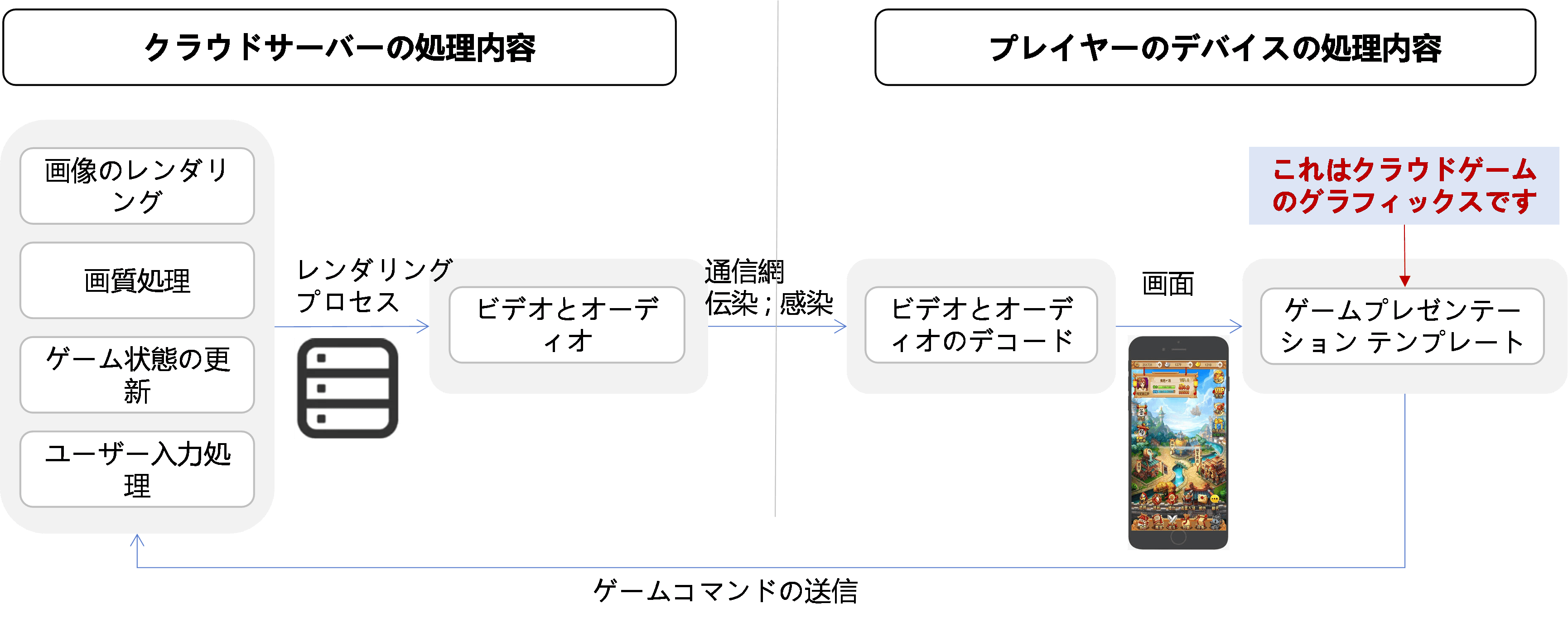クラウドゲームの場合、ゲームはプレイヤーのデバイスではなく、クラウドサーバー上で実行され、クラウドサーバーがゲームシーンをビデオおよびオーディオストリームにして、プレイヤーのゲーム端末にネットワーク経由で転送します。