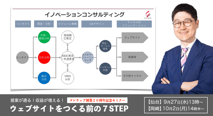 株式会社ゴンウェブイノベーションズ(本社:東京都北区、代表取締役:権 成俊)は、全国13ヵ所で開催しているセミナーツアー『提案が通る!収益が増える!ウェブサイトをつくる前の7STEP』が9月27日(水)仙台、10月2日(月)愛知県岡崎市にて最終を迎えることをお知らせいたします。