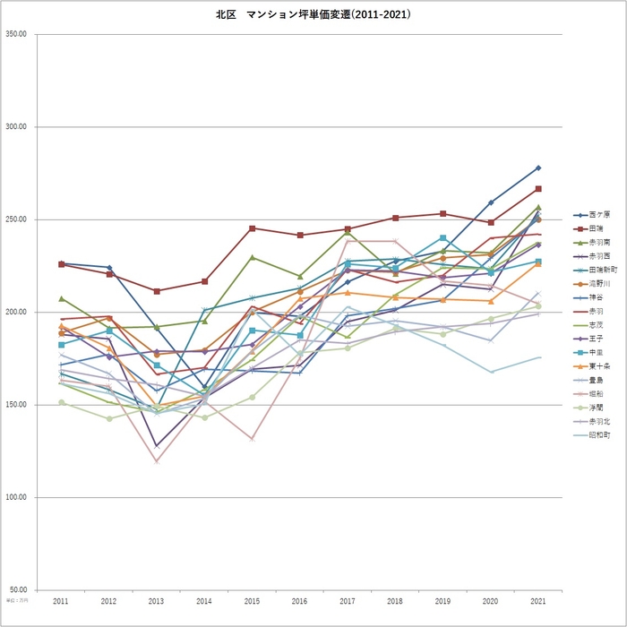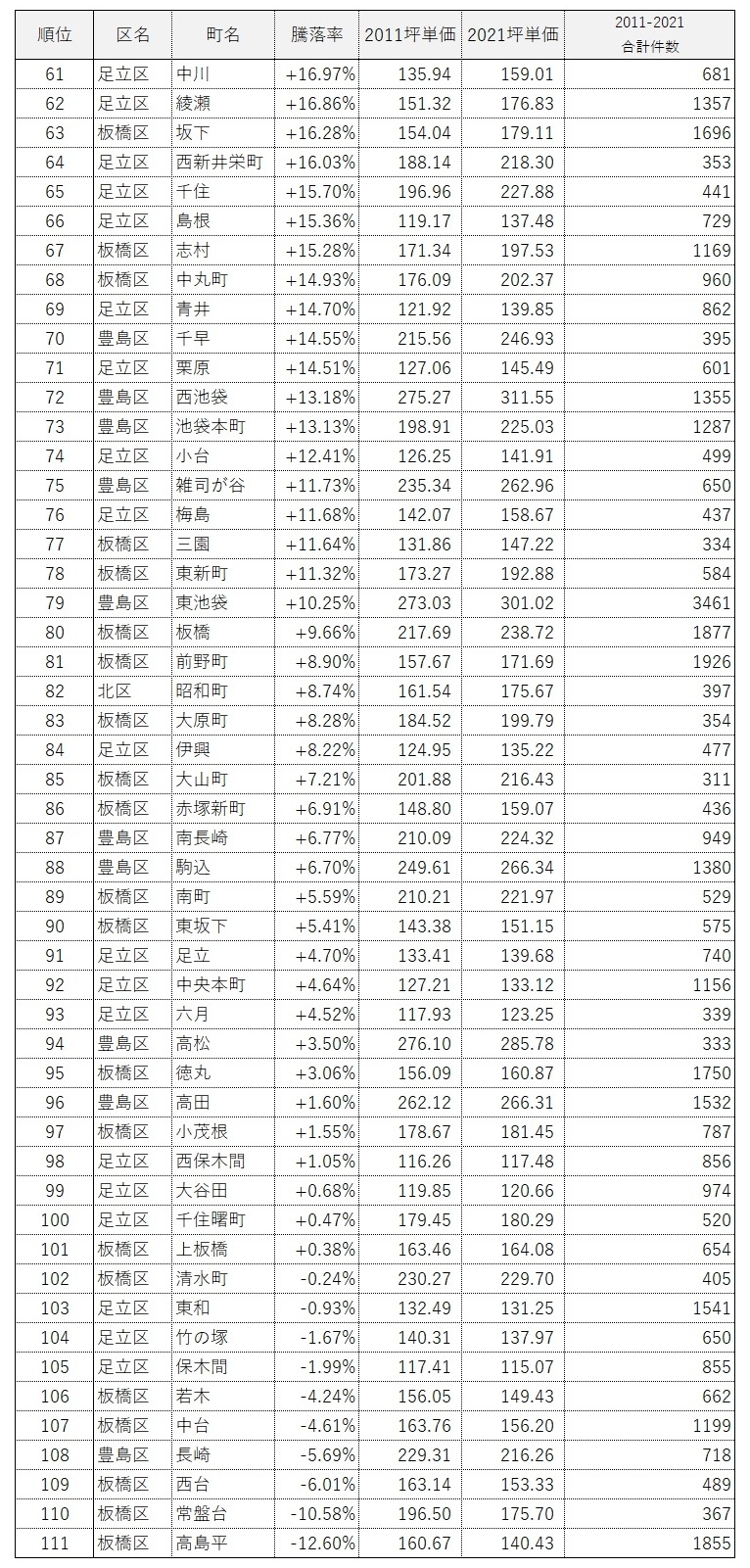 2011年と2021年のマンション坪単価より騰落率を算出。