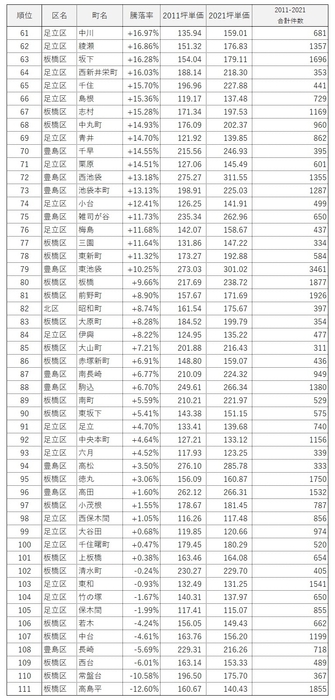 *2「10年騰落率ランキング(2011-2021)」は、2011~2021年の販売履歴件数が300件以上あり、かつ各年度での販売履歴件数が2件以上ある全111町名を対象に集計。