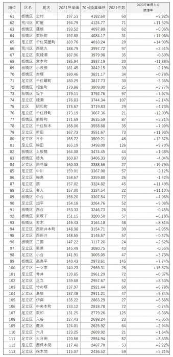 ・ランキング対象の全113町名のうち、前年より価格が上昇した町名は99ヶ所。約88%の町名で、コロナ禍でも価格上昇した2020年より、さらに坪単価が上昇している。
