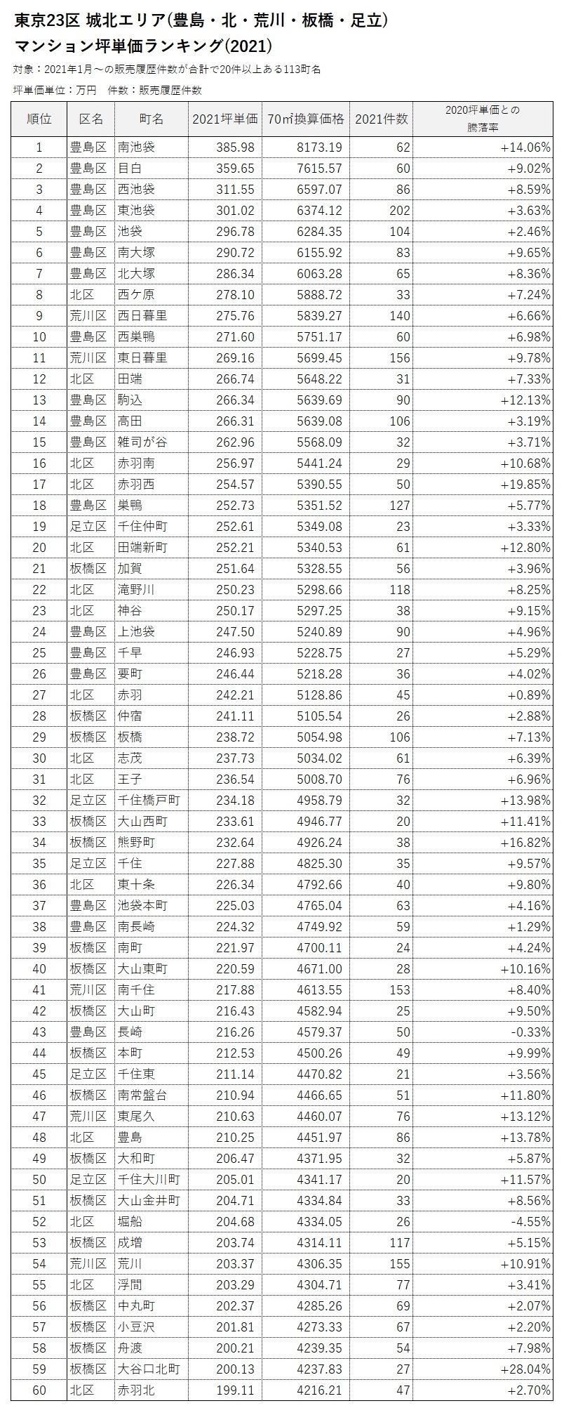 第6弾となる今回は、「城北」(豊島・北・荒川・板橋・足立)をピックアップ。マンション坪単価および2011年の坪単価と比較した騰落率のランキングを発表いたします。