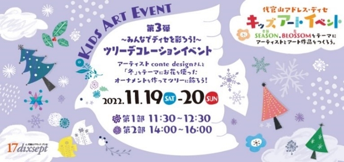 また、代官山アドレス・ディセでは四季を通じ、子ども参加型のアートプロジェクト「キッズアートイベント」を開催しています。11月19日(土)~11月20日(日)に開催するキッズアートイベント第3弾のテーマは「冬」。アーティスト『conte design』*を招き、ツリーデコレーションイベントを実施いたします。『conte design』が今回のためだけに制作したツリーモチーフのオブジェに子ども達の手作りオーナメントを飾りつけ、どのような作品が出来上がるか、代官山アドレス・ディセにて是非ご覧ください。