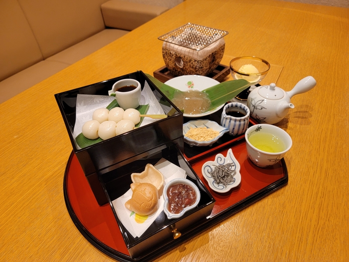 甘味箱には、口の中でとろーりとろける国産わらび粉を使った自家製わらび餅、七輪でお好みの焼き加減で味わえる自家製みたらし団子、粒の大きな北海道産小豆を使った自家製粒餡(あん)を挟んで味わえる最中がセットになっています。