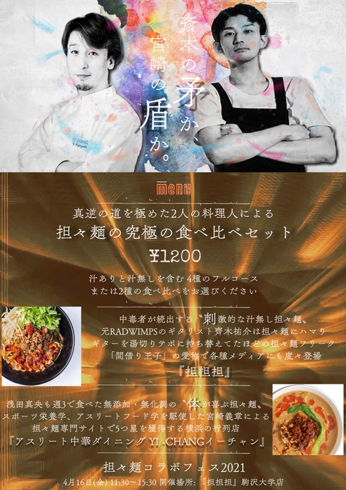 それぞれの道を極めた二人のシェフが駒沢大学で激突します。いずれも負けず劣らず個性的な実力者。個別に食べてもよし。混ぜて食べてもよし。二度とないかもしれない個性の共演を是非お楽しみください。
