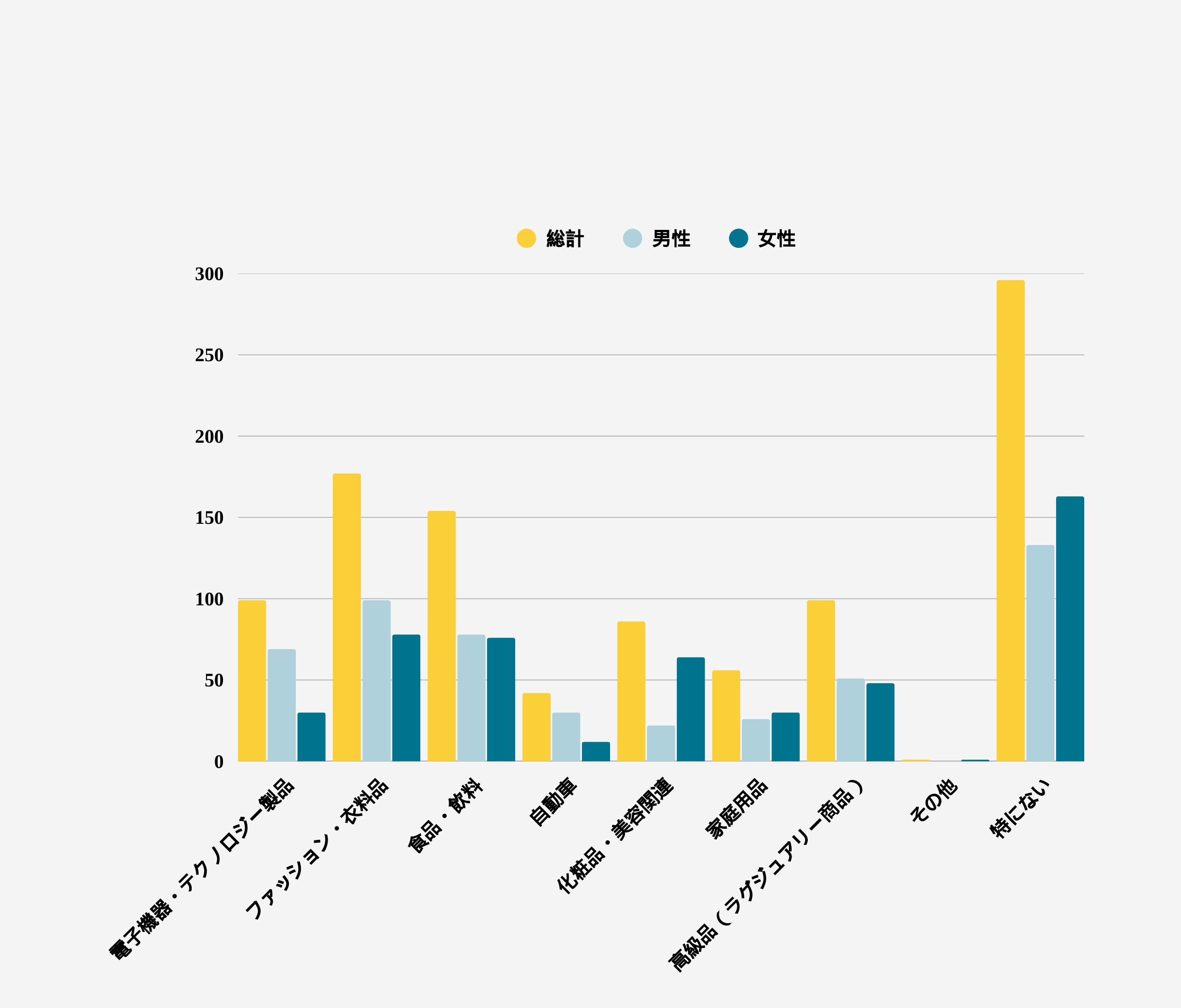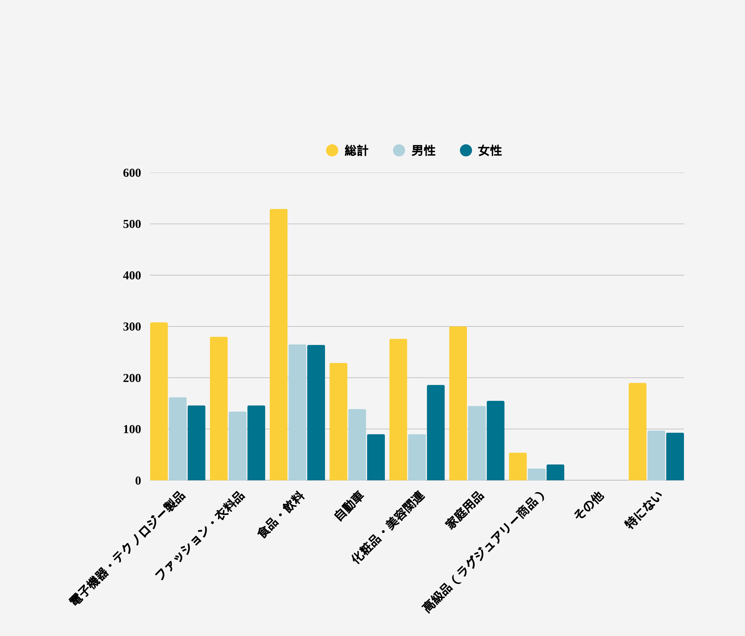 このデータは、男性が国内自動車を好む割合が高く(約33% 対 女性21%)、一方で女性は国内化粧品・美容関連を支持する割合が非常に高い(約44% 対 男性21%)ことを示しています。