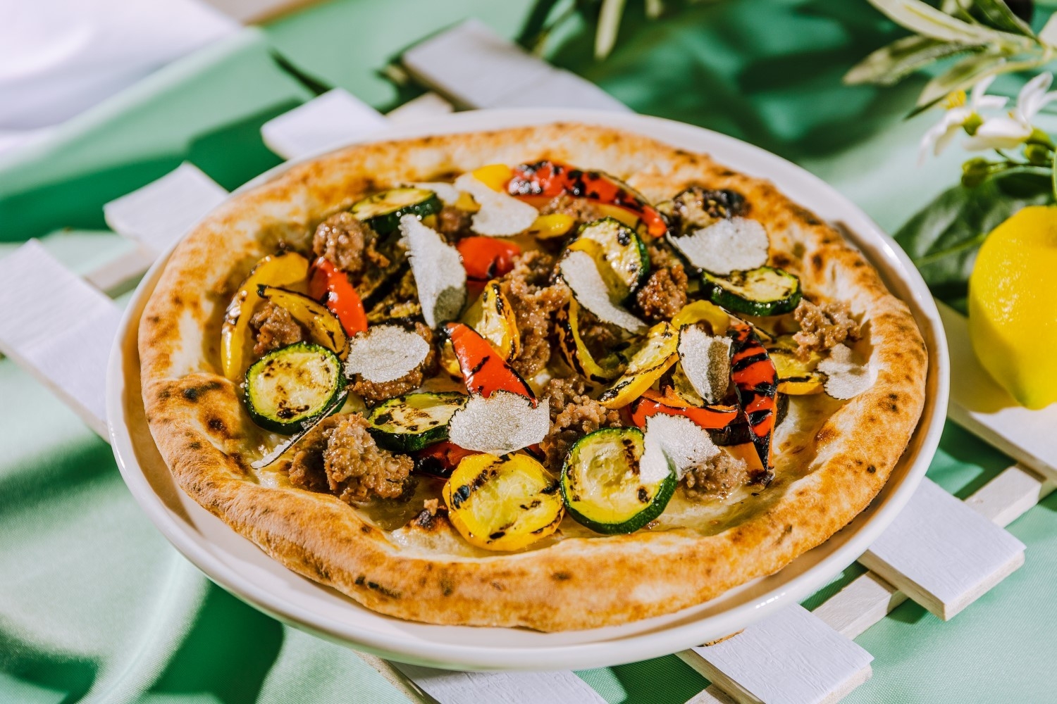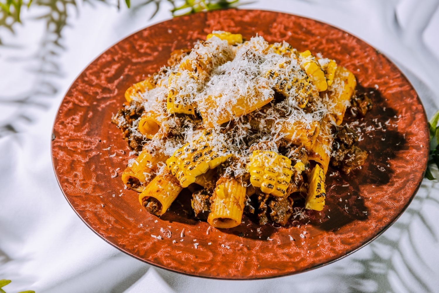 シェフのおすすめ料理には香りと食感が楽しめる「自家製サルシッチャの黒トリュフ 夏野菜のピッツァ」や王道パスタには夏らしくトウモロコシを使用し、「和牛とトウモロコシのボロネーゼ リガトーニ」をご用意。