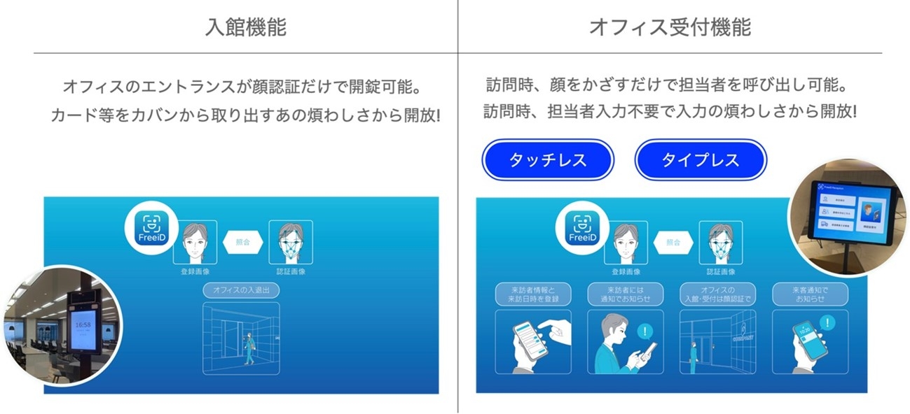 当社の新オフィスでは、当社子会社DXYZ(ディクシーズ)がサービス展開する顔認証システム「FreeiD(フリード)」を導入しており、社員のオフィスへの入退室はもちろん、来客者の方は顔認証だけ(タッチレス)で担当者呼び出しが可能です。来客者の方は担当者名入力不要(タイプレス)で入力の手間の煩わしさもありません。