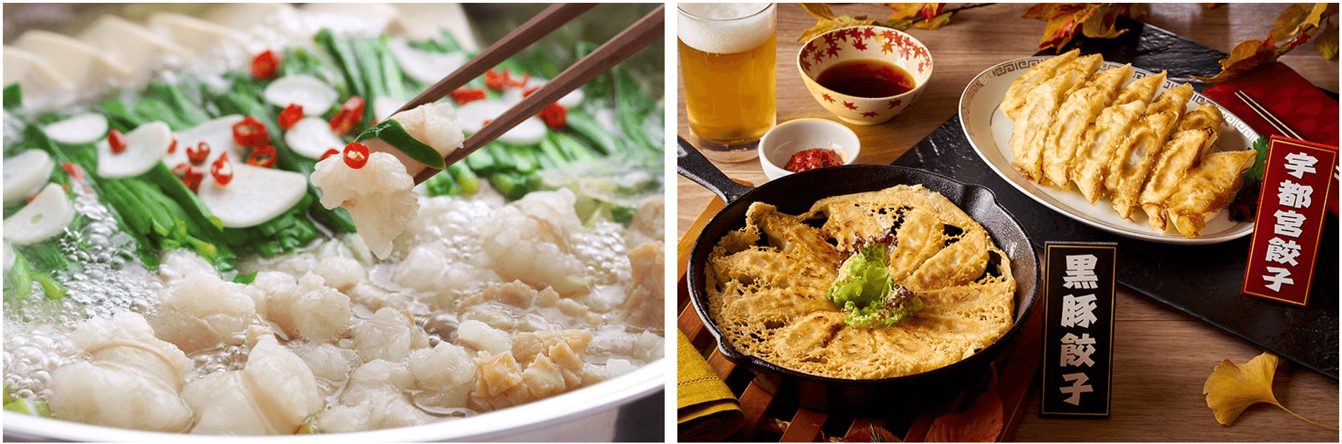 右:期間限定で「黒豚餃子」が登場。定番の「宇都宮餃子」とその美味しさを味比べでお楽しみください。