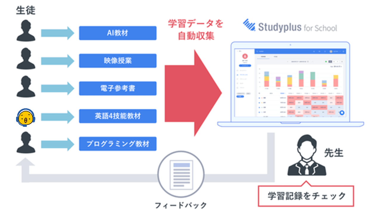 スタディプラスが提供する「Studyplus for School」は、生徒と先生を学習管理アプリ「Studyplus」でつなぎ、生徒の日々の学習ログを先生が見守り助ける、教育機関向け学習管理プラットフォームです。市販のデジタル教材との連携や自作の単語帳の登録など、あらゆる教材での学習記録を付けることができるため、生徒たちの学習状況の一元管理が可能です。デジタル教材と「Studyplus for School」のデータ連携を可能にするために、事業者向けのAPI「Studyplus for School SYNC(シンク)」を提供しています。