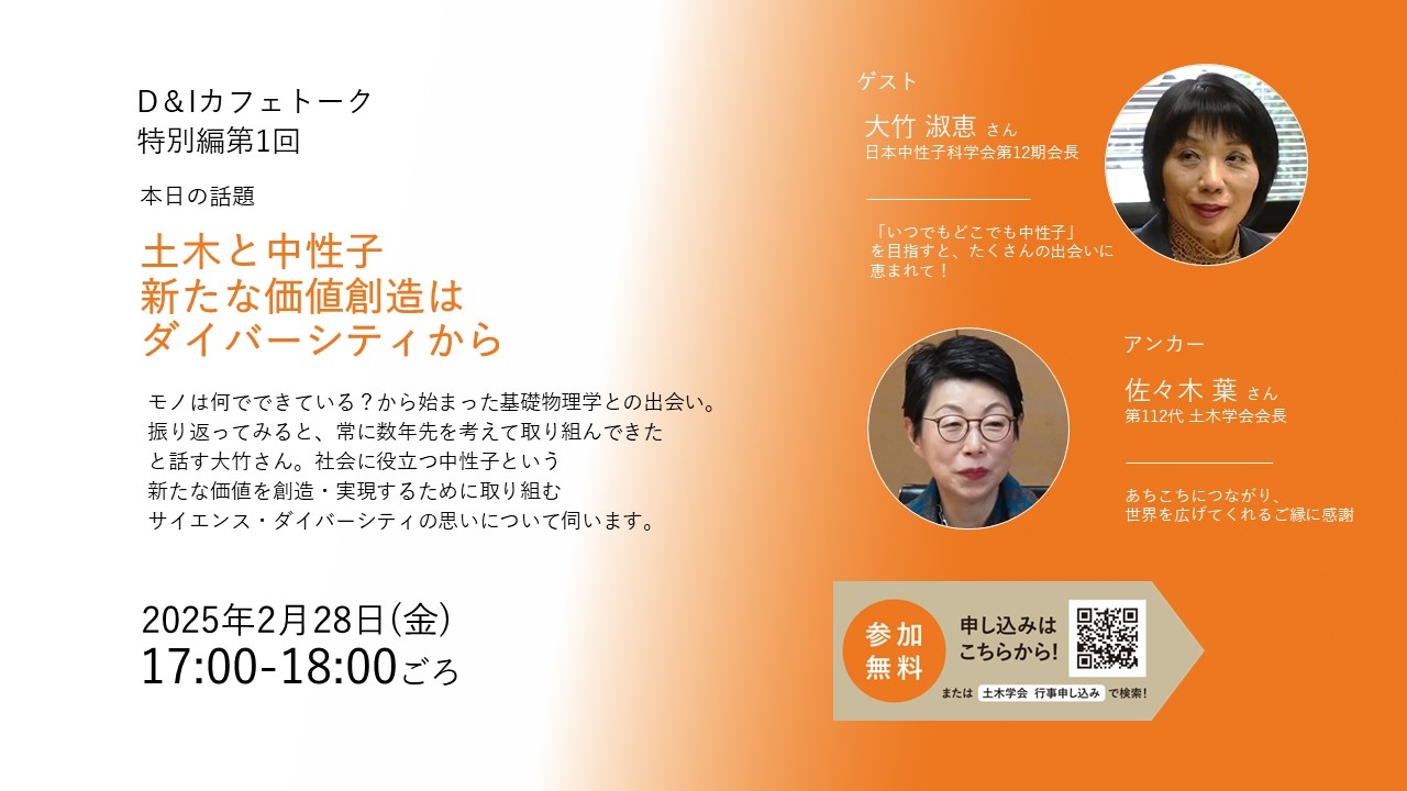公益社団法人土木学会(会長 佐々木葉)は、佐々木葉 第112代土木学会会長と大竹淑恵第12期日本中性子科学会会長の対談を、D&Iカフェトーク特別編第1回「土木と中性子 新たな価値創造はダイバーシティから」として2月28日(金)にオンライン配信します。