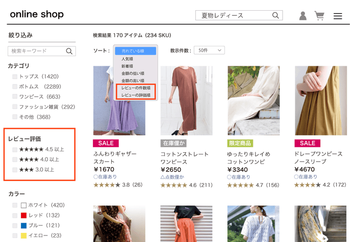 商品をレビューの件数順や評価順に表示したり、レビュー評価が高い商品のみを絞り込んで表示したりすることが可能です。